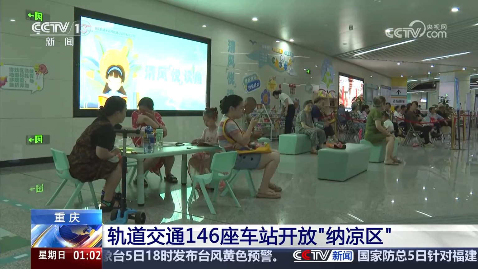 在重庆,7月4日起,146座轨道交通车站为公众开放了纳凉区,相较于去年新增了6座车站,各站点都配备了急救箱和各类防暑降温用品。暑期来临,纳凉区还专门设置了阅读教育区、互动游戏区、环保教育区等主题区域。